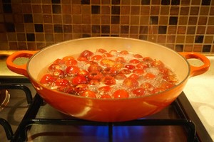 继续中小火煮,二十分钟后,山楂果变得颜色深,锅里汤汁变少变浓,然后开大火收汁。