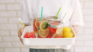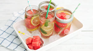 做法很简单,就是把西瓜块、柠檬片、薄荷叶放到饮用水里,密封放入冰箱冷藏8h以上,就有好喝的夏日水果沁饮啦~