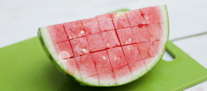 刀面平西瓜的另一面(与桌面大概呈45度),切3cm宽;