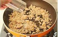 平底锅中倒入一丁点食用油,加入豆渣,先用中火翻炒,待豆渣炒至水分微收,加入生抽