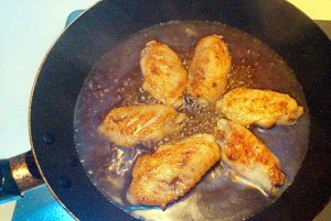酱汁儿入锅大火烧开后转小火烧,给鸡翅翻几次身,使两面都裹上酱汁儿