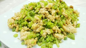 肉馅放锅中快速翻炒,再加入苋菜菜杆,调味,出锅~