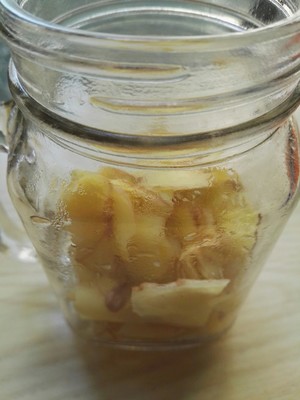 腌好的姜片稍稍挤一水,放入玻璃瓶中。