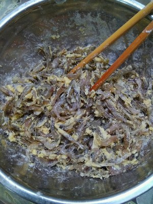 控干水的小虾米加入适量面粉,玉米面粉,少许盐和小苏打。(玉米面有利于蓬松,小苏打有利于色泽红亮,这个也可以省略。)