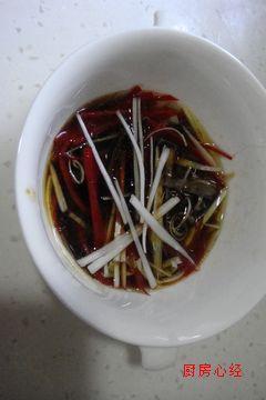 红椒切细丝,葱除去葱心不要,只要葱白,切丝即可,然后泡入凉水中,去除辣味,葱也不打卷了