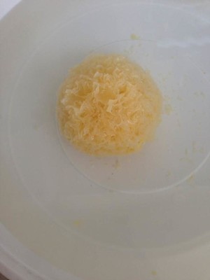 第一张。银耳一个,在银耳球中,这一个算中等大。23克,长得难看不要紧,质底好才是,哪我们再来看看浸发程度吧