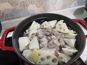铸铁锅里放排骨,藕,洗过的花生,加两片姜煮大火煮开后小火慢炖。不用放其他调料了,焯水的时候放过葱和料酒了。我不想别的味道盖住食材本身的味道~