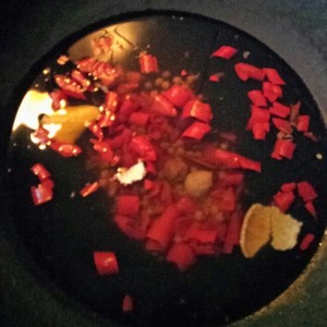 两碗水的量煮开 放花椒 大料 辣椒 陈皮 煮开 放少许盐调味 放凉