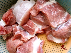梅花肉,我们这里又叫前夹肉,瘦肉为主,中间肥肉纹理清晰,肉切块洗净晾干,为了方便烤熟,不宜太厚,大概1cm-1.5cm厚度的样子。
