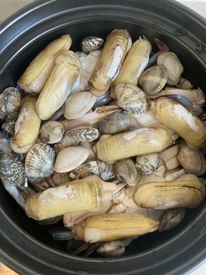 蛏子花蛤吐沙清洗一下(明虾放在另外一个注氧袋忘记拍了 也要家里干净的水冲洗一下)
