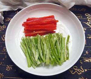20分钟后,锅中热油,先下青辣椒,红椒丝下锅翻炒变颜色,捞出来放碗中备用。