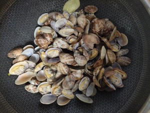 1. 先将花蛤稍微洗一下,然后放入冷水中,加盐+香油,用手抓,多抓几下,然后放一会,让它吐沙。