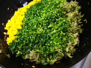 槐花和韭菜放入炒鸡蛋的锅里,我手边正好有些小葱,放一点葱碎,没有可以不放。先放点玉米油拌一下,锁住蔬菜的水分。