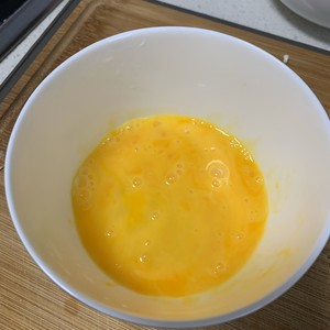 6. 两勺面粉、一勺玉米淀粉、倒进鸡蛋液里、搅拌、这时你会发现有点干、清水10克倒进去、搅拌、水不能多、多了面糊就稀了、