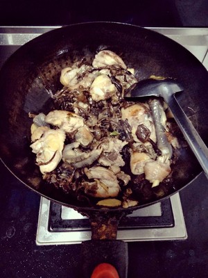 2. 起锅倒入适量油,油热后放葱姜爆锅,放入鸡肉翻炒3分钟,然后加入适量盐(后期还要加,所以这里适量就行)继续翻炒5分钟。