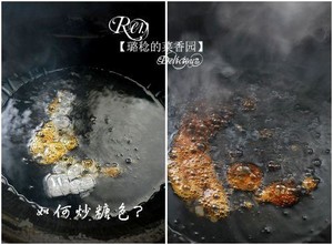 如何炒出漂亮的糖色: 一般用冰糖,冷油入锅,搅动糖粒,看着糖逐渐消融,油中泛起小泡沫,颜色慢慢加重,转为深褐色,ok!~~放鸡肉。
