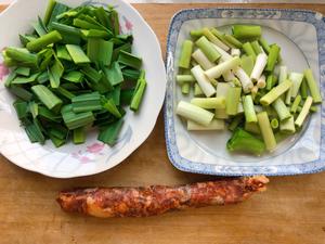 准备食材,蒜苗叶子跟蒜苗茎分别切段装盘备用,腊肉用淘米水或清水冲洗干净