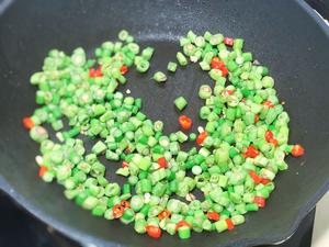 先放豆角和小米辣,把豆角先基本炒熟。
