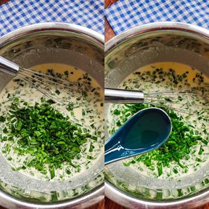 把切碎的韭菜放入面糊盆中,加上一勺菜籽油。