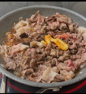 3. 将普通切片牛肉放入平底锅中,用中火翻炒,接着加入为它准备的调味料,煮到汤汁浓稠盛出。