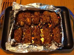 烤盘垫铝箔,排列好排骨,将腌酱继续抹在排骨上,炒锅内油烧热关火,将大量蒜末炒出香味,连油一起铺在排骨上,封好铝箔。