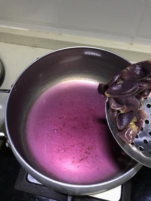 捞出葡萄皮,加一丁点盐,一点点就可以。颜色很好看吧!