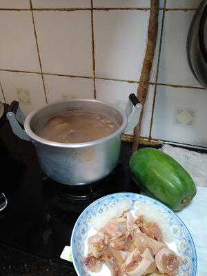 湯煲2個鐘後擺淮山和木瓜,手機馬上教20分鐘。