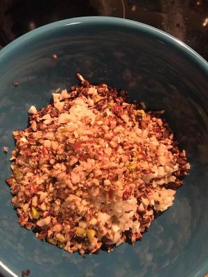 蘑菇 蒜 坚果 切碎放在一起。有食物料理机的可以打碎,因为我喜欢稍微有点颗粒感的 所以就手切了