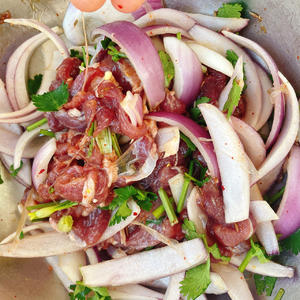 香菜切段,洋葱切条,盐,孜然,生抽蚝油,辣椒面和抓好的羊肉抓匀。