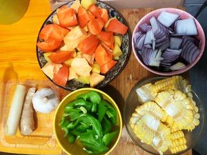 在上边摆上青椒,鸡翅,玉米