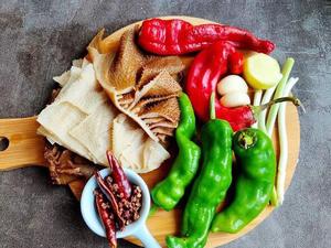 2.姜蒜拍碎切好,葱切好,辣椒切丝,百叶切丝