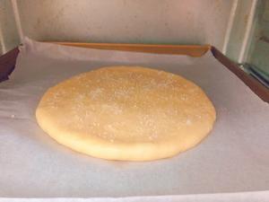 取出包有芝士馅的面团,用擀面杖擀成直径大约20厘米的圆饼继续醒发10-15分钟。