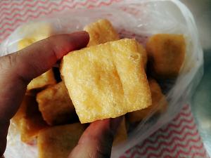 超市买的白玉鸭血,一块300g,切成1.5厘米左右的方块,清水冲洗两遍后放点盐泡上备用